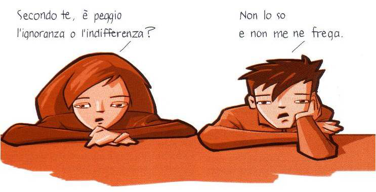 «Vedo al telegiornale le file di profughi e il sangue di bimbi uccisi, ma rimango indifferente. Vivo nel mio piccolo mondo tranquillo e non tollero intrusioni: la mia casa, la mia famiglia, i miei amici, i miei voti, i miei problemi... Ho già abbastanza grattacapi così, quindi non sento il bisogno di andarmi a sobbarcare pure i guai degli altri. E comunque non ci posso fare niente»